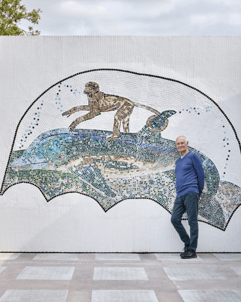 A standout piece from the collection is a remarkable mosaic panel by the renowned sculptor Dame Elisabeth Frink (1930–1993). This piece, ‘The Monkey and the Dolphin,’ was originally part of the swimming pool at Woolland House, Frink’s Dorset country estate. The mosaic, based on an Aesop fable, was designed in 1987 and is considered one of her largest and most significant works. It is thought to be the only mosaic Frink ever created.